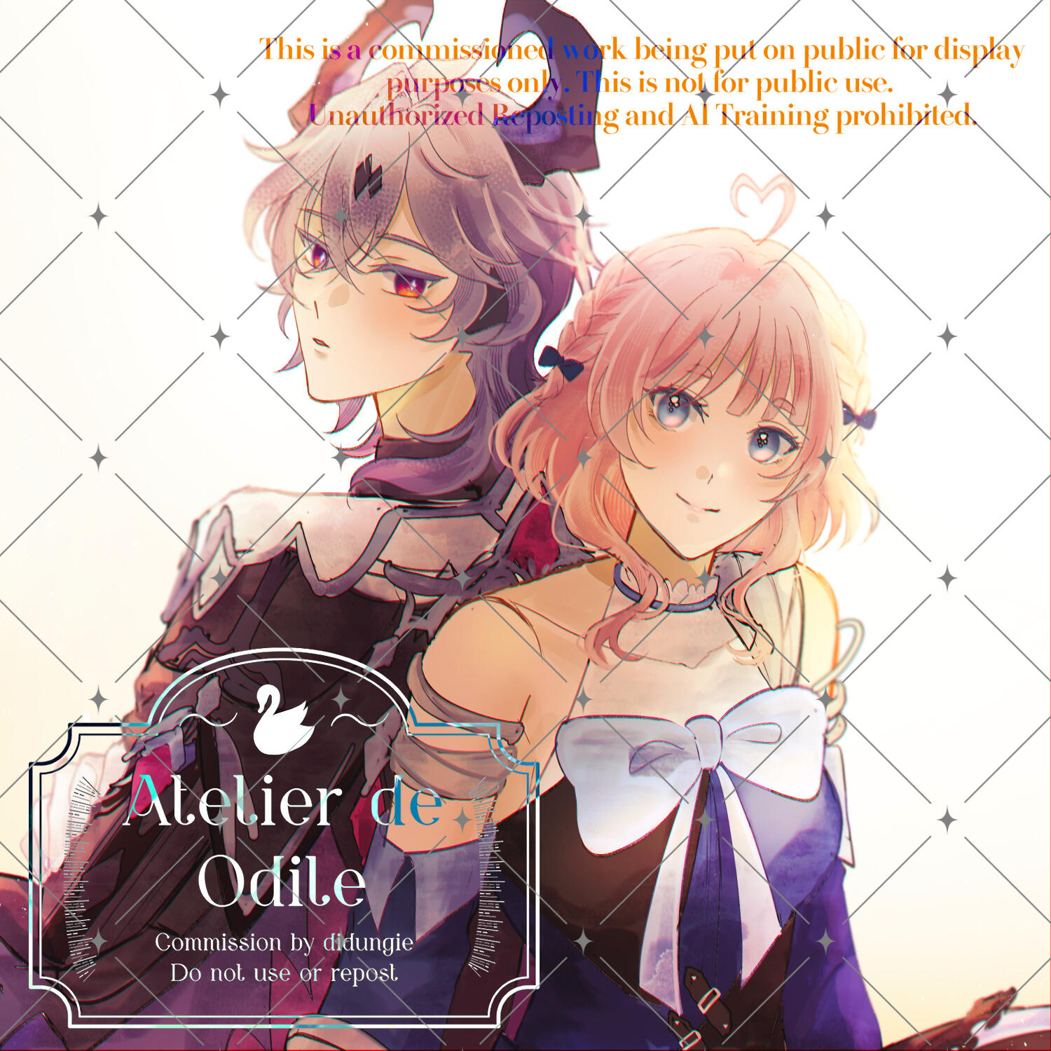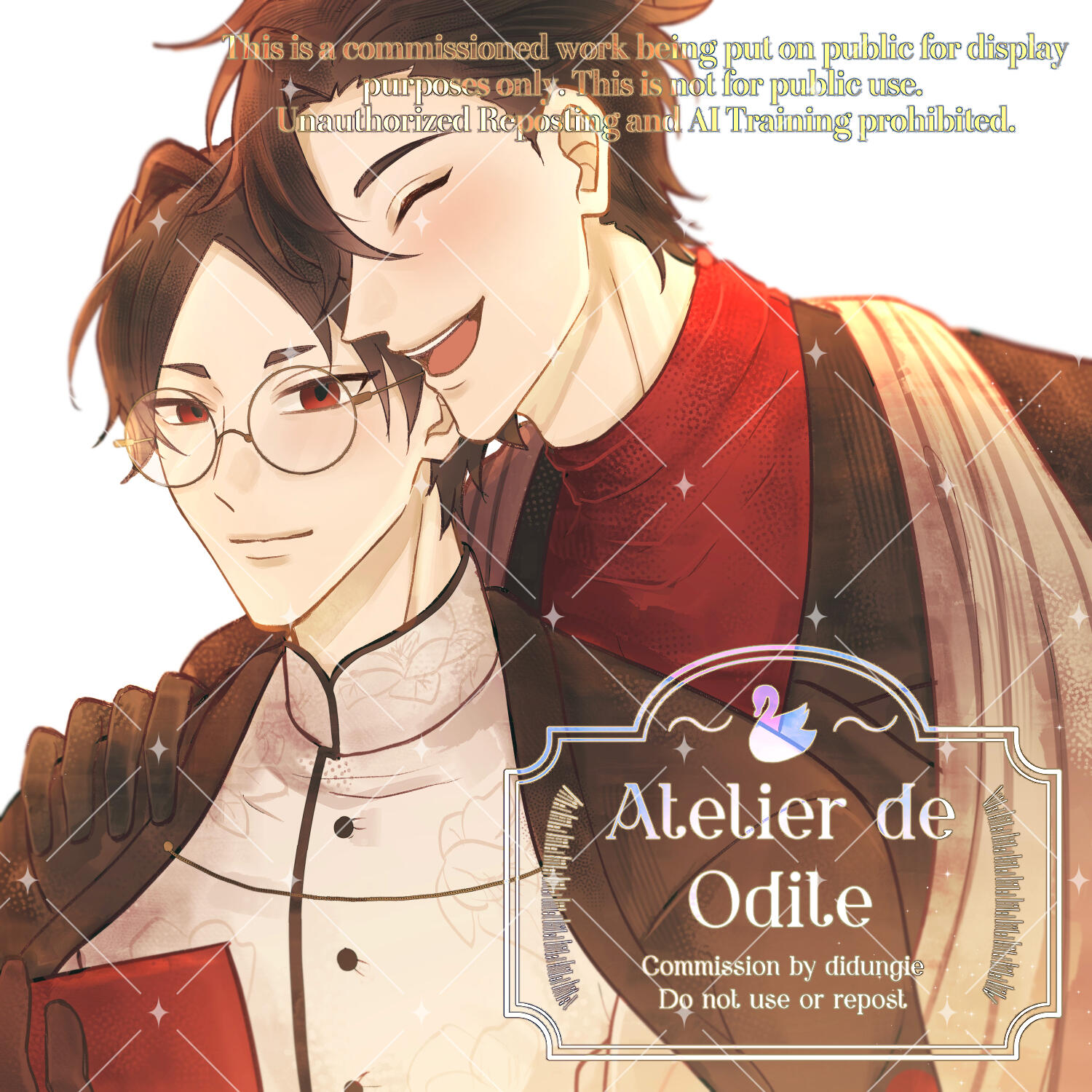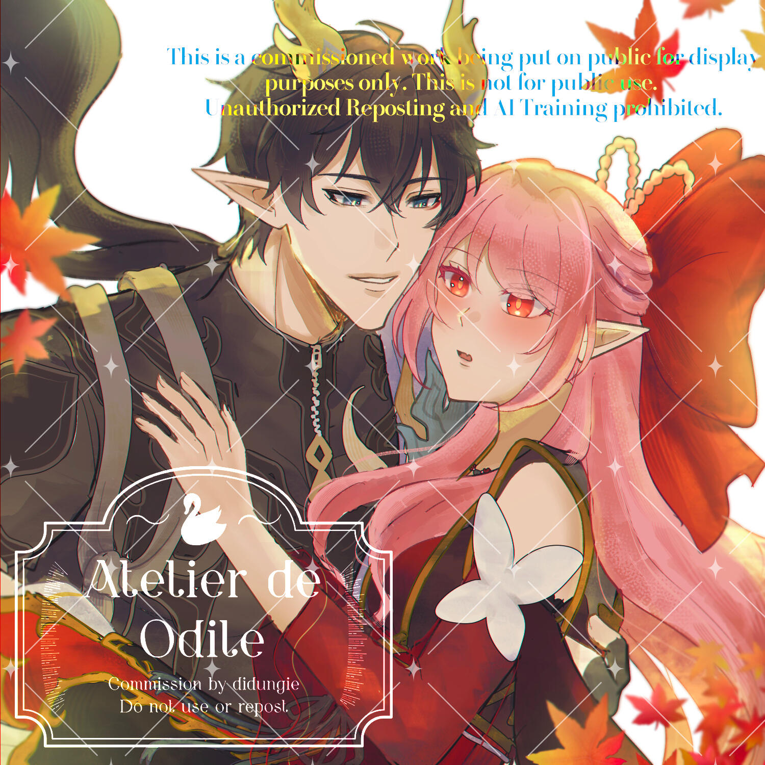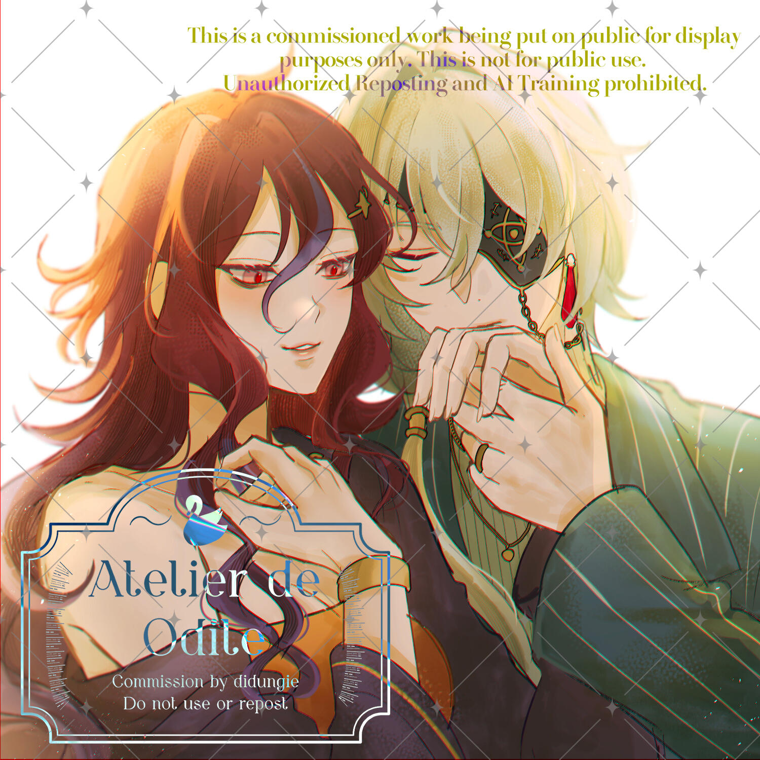 Please provide me with a clear information of your character and references. (I prefer to have you also provide clear information of the couple (dynamic, the kind of atmosphere you desire, etc.) so I can have a better understanding of their relationship.)Only white/flat color/decorative backgrounds can be accepted.
